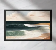 Questa illustrazione marittima mostra una veduta dall'alto del mare e della costa, con onde alte e onde dolci. I tenui colori pastello verde e beige creano un'atmosfera rilassante che ricorda i viaggi estivi e la bellezza della natura. Ideale per gli amanti dell'arte costiera e dell'atmosfera estiva.