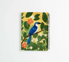 L'immagine mostra una ghiandaia azzurra stilizzata su un ramo, circondata da foglie verdi e fiori colorati. L'uccello ha un piumaggio blu brillante con accenti bianchi e neri. Lo sfondo è di un giallo solare e i fiori presentano vivaci accenti di colore bianco e arancione. Lo stile è illustrativo e artistico, con colori vivaci e linee pulite. Ha un'espressione vibrante e dettagliata che cattura la bellezza della natura in modo giocoso.