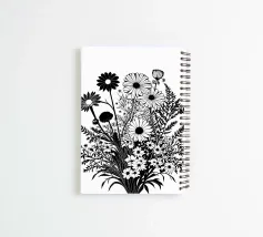 Una composizione botanica in bianco e nero presenta un assortimento di fiori selvatici e fogliame intricato e intrecciato. La composizione cattura varie forme e dimensioni, creando un ricco arazzo di elementi floreali.