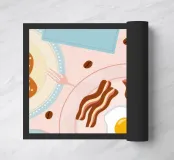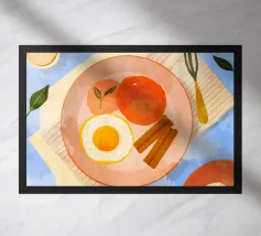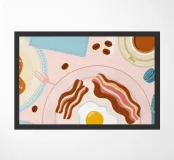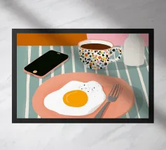 Vista dall'alto di un tavolo per la colazione con croissant, bacon, uova, caffè e una lettera. Lo stile è moderno, pulito e cattura un momento mattutino perfetto.