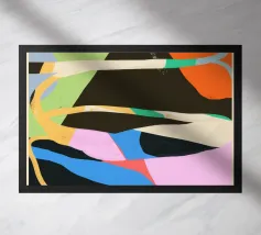Una composizione astratta dinamica e caotica, caratterizzata da un mix di forme organiche, strisce audaci e altri motivi in una tavolozza di arancione, nero, bianco e blu.