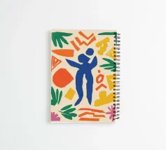 Una composizione astratta di figure umane danzanti e forme botaniche in colori primari, ispirata ai ritagli di Maraoui, che celebra il movimento, la gioia e la forma umana.