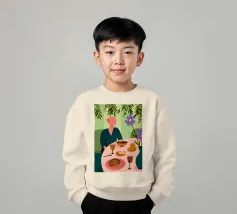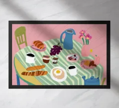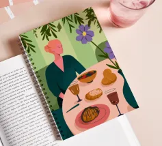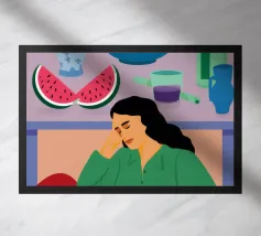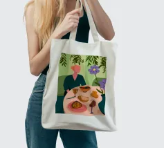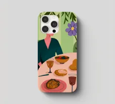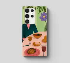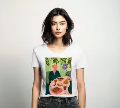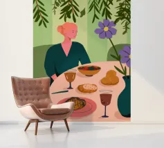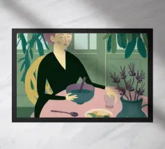 Questo dipinto illustra una persona seduta a un tavolo da pranzo con vari cibi e bevande, tra cui pane, vino e una ciotola di zuppa. Lo sfondo è caratterizzato da grandi foglie e fiori verdi.