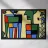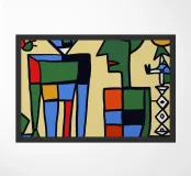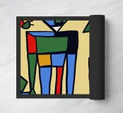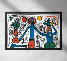 Two geometrically stylized figures dominate the foreground, each featuring a unique assembly of brightly colored shapes. A third character appears in the background, colorful and sporting a single large eye, adding to the lively and abstract nature of the composition.