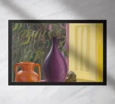 Una vivace natura morta mostra una collezione di vasi colorati (viola, blu, a righe), ciotole e oggetti decorativi disposti ad arte sul piano di un tavolo giallo brillante contro una parete segmentata rosa e verde.
