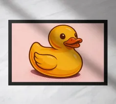 A highly detailed and realistic illustration of a bright yellow rubber duck sitting against a soft blue background. The glossy finish and vibrant colors highlight its cheerful and playful character.