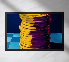 I mucchietti di monete lucide sono disposti a varie altezze, circondati da monete sparse, tutte illuminate su uno sfondo nero, creando un contrasto accattivante.