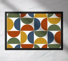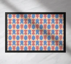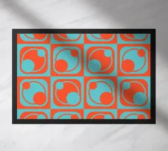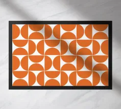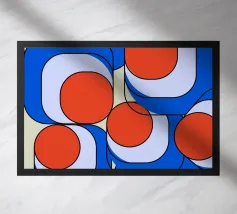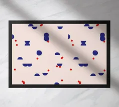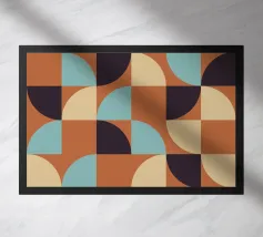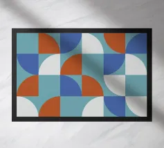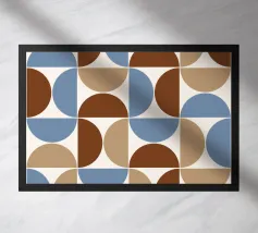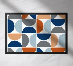 Un motivo geometrico ripetitivo presenta file alternate di semicerchi e cerchi nei colori blu e ruggine su uno sfondo chiaro. Il disegno crea un senso di ritmo e movimento grazie alla sua disposizione simmetrica.