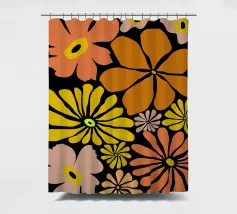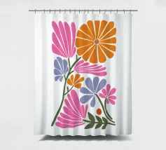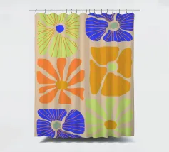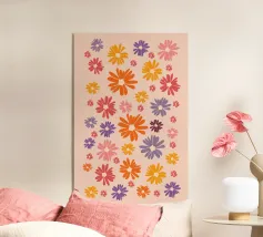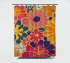 Un motivo floreale giocoso che sembra una passeggiata visiva in un festival di giardini retrò: I fiori stilizzati, nei colori arancione, rosa, viola, rosso e giallo, danzano liberamente. Ogni fiore ha una forma semplice, simile a una margherita, con lunghi petali a raggiera che emergono da un punto centrale. La disposizione è volutamente irregolare, come un disegno sparso di gioia, estate e nostalgia.