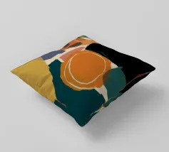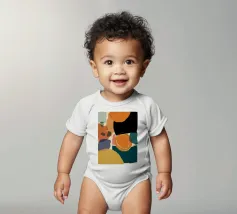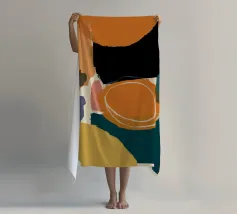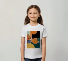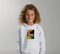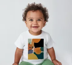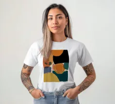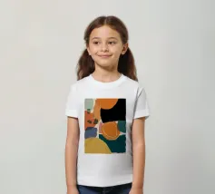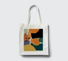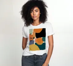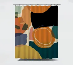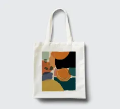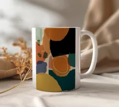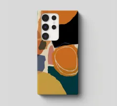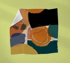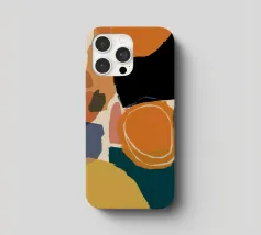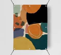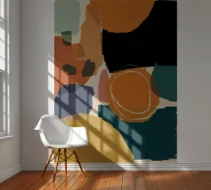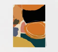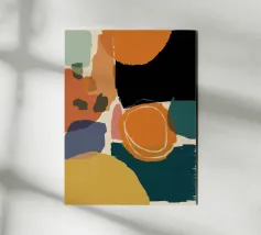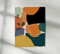 Un'opera d'arte astratta con una composizione calda e invitante di forme organiche sovrapposte in una tavolozza di terracotta, marrone e giallo senape. L'opera è moderna, rilassante e ricca di calore testuale.