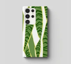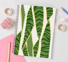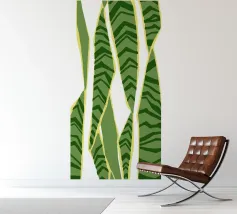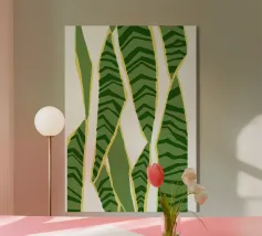 I motivi geometrici astratti a strisce verdi e gialle creano un senso di movimento nella composizione. Il disegno presenta elementi verticali di forma irregolare che suggeriscono un tema naturale.