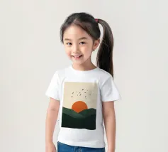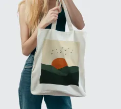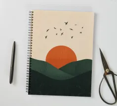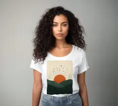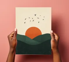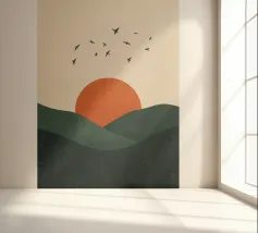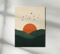 Immergetevi nella tranquilla bellezza di "Sunset Hills with Birds", una stampa digitale minimalista che evoca la serena magia del crepuscolo. Questo pezzo sorprendente presenta un sole arancione bruciato, che tramonta o si alza dolcemente dietro a dolci colline astratte rese con profonde sfumature di verde foresta. Perfetto per le case contemporanee, per gli interni moderni di metà secolo o per qualsiasi spazio che cerchi una dichiarazione calma, terrena e artistica. Elevate il vostro arredamento con questa miscela unica di semplicità grafica e meraviglia naturale.