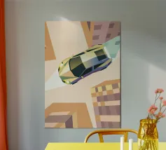 Illustrazione di un'auto d'epoca colorata nel deserto con uno stile geometrico moderno.