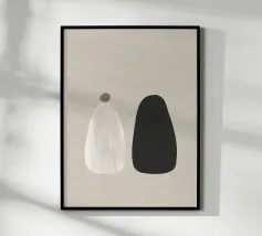 Un'opera d'arte astratta minimalista con un triangolo e due cerchi sovrapposti dal sapore vintage. Circondata da un ampio spazio bianco, crea un senso di calma ed equilibrio, perfetto per gli interni moderni e scandinavi.