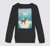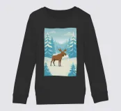 Design minimalista con un alce in una foresta di conifere con abeti o abeti rossi coperti di neve. Design decorativo invernale con un tipico animale selvatico scandinavo, originario tra l'altro di Svezia, Norvegia e Finlandia.