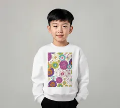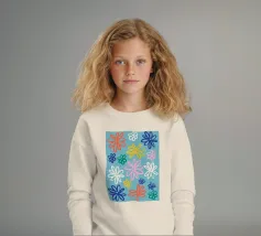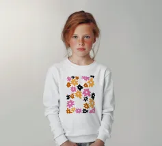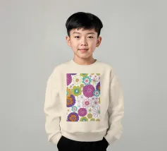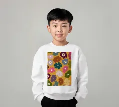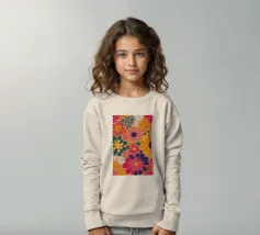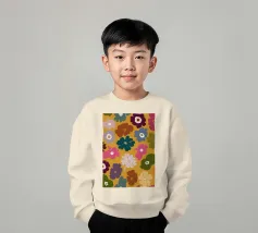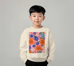 Un motivo floreale giocoso che sembra una passeggiata visiva in un festival di giardini retrò: I fiori stilizzati, nei colori arancione, rosa, viola, rosso e giallo, danzano liberamente. Ogni fiore ha una forma semplice, simile a una margherita, con lunghi petali a raggiera che emergono da un punto centrale. La disposizione è volutamente irregolare, come un disegno sparso di gioia, estate e nostalgia.