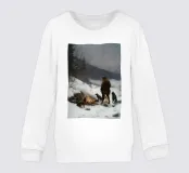 Un suggestivo motivo invernale: un cacciatore si trova con i suoi cani accanto a un falò riscaldante nel mezzo di un paesaggio montano innevato. L'immagine trasmette un senso di avventura, vicinanza alla natura e la tranquilla bellezza dell'inverno. I caldi accenti di luce del fuoco contrastano con il fresco paesaggio innevato e creano un'atmosfera suggestiva. Ideale per murales, tazze, cuscini o tessuti: un disegno unico per tutti coloro che amano l'aria aperta, la caccia, la natura e il romanticismo dell'inverno.