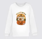 Animale capibara super carino seduto nella zucca intagliata di Halloween con un arcobaleno arancione, fiori, testo in stile autunnale citazione Ciao Zucca