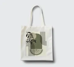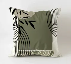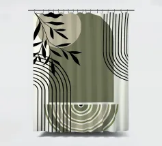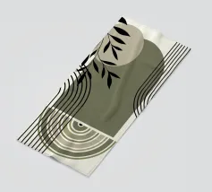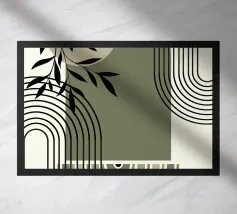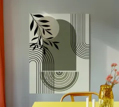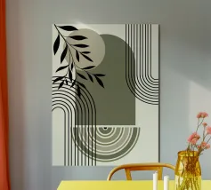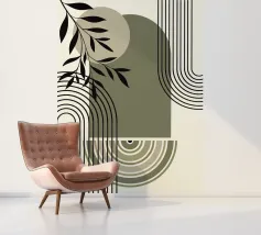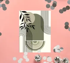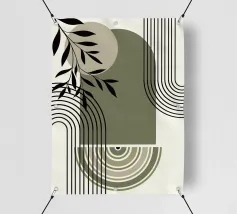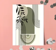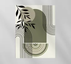 Forme geometriche astratte e linee curve creano una composizione armoniosa nei toni del verde e del nero. Un elemento botanico aggiunge un tocco organico tra le forme strutturate.