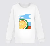 Illustrazione che mostra un frutto di durian spaccato, con un cielo blu e nuvole sullo sfondo.