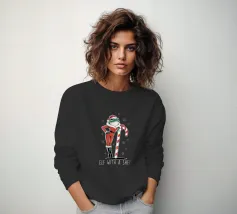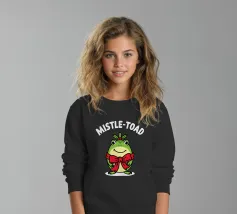 Una rana vestita da Babbo Natale si erge fiduciosa con una mano su un bastoncino di zucchero, circondata da piccoli fiocchi di neve. Sotto la rana, la didascalia recita "Elfo con lo scaffale".