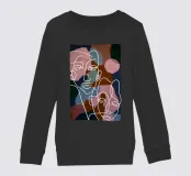 Questa opera d'arte presenta una serie di disegni al tratto di volti interconnessi su uno sfondo scuro. Le linee sono continue e creano un senso di unità e connessione.