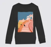 Un'incantevole illustrazione di un gatto nero seduto sui gradini di una bella città di mare, con edifici resi in rosa tenue. La scena è tranquilla, pittoresca e piena di fascino mediterraneo.