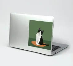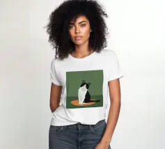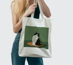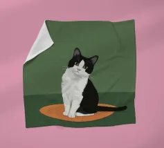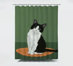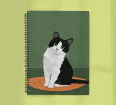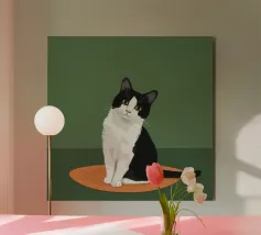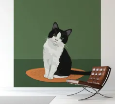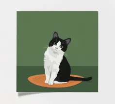Un bel gatto tuxedo bianco e nero siede in una posizione composta ed elegante, guardando direttamente l'osservatore con un'espressione calma e gentile, catturata in un ritratto semplice e bello.