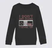 Un controller di gioco retrò è accompagnato dalla frase "Non invecchio, salgo di livello", utilizzando uno stile di carattere nostalgico. Questo design combina la cultura del gioco vintage con una visione umoristica dell'invecchiamento.