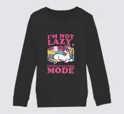 Un unicorno colorato con una criniera arcobaleno si trova sotto la frase "Non sono pigro, sono in modalità risparmio energetico" in lettere rosa. Lo sfondo è caratterizzato da un blocco di colori pastello che esalta il tema giocoso e stravagante.