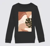 L'immagine presenta un'illustrazione astratta con una grande foglia di monstera nera e il contorno di una mano. Lo sfondo è costituito da forme morbide e fluide nei toni del beige e del marrone, che creano un'atmosfera armoniosa e organica.