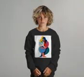 Una composizione astratta stilizzata presenta forme sovrapposte dai colori vivaci, che danno l'impressione di una persona seduta. L'uso audace di blu, rosso, arancione e verde acqua crea un senso dinamico di movimento e forma.