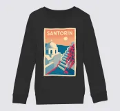 Questo poster vintage di Santorini illustra il fascino unico dell'isola greca con le sue case bianche, la cupola blu e le bouganville in fiore sul bordo del Mar Egeo. Un poster mediterraneo luminoso che invita al viaggio e al relax.