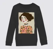 Il dipinto raffigura una persona con capelli corti e scuri acconciati a onde, che indossa un abito con motivi retrò e cerchi e diamanti nei toni del rosa, del marrone e del beige. Lo sfondo è di un semplice colore beige chiaro.