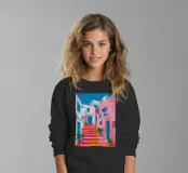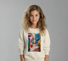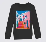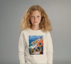 Quest'opera d'arte cattura la bellezza iconica di un'isola greca con i suoi gradini vivaci e colorati nei toni del rosa, dell'arancione e del rosso. La classica architettura bianca e blu incornicia la scena, creando un'immagine gioiosa e pittoresca che trasporta immediatamente in un vicolo soleggiato di Santorini.
