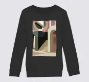 Uno spazio architettonico astratto è definito da una scalinata spoglia e da archi sovrapposti, con un drammatico gioco di luci e ombre che crea una composizione potente e minimalista.