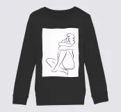Un semplice disegno al tratto raffigura una persona seduta con i capelli ricci, le braccia avvolte intorno alle ginocchia. Lo stile minimalista utilizza linee morbide e fluide per trasmettere un senso di calma e introspezione.