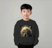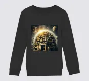 Una struttura architettonica futuristica simile a un pianeta, con intricate facciate geometriche e motivi luminosi, circondata da oggetti sferici orbitanti sotto un cielo cosmico, illuminato da una radiosa luce celeste. L'immagine combina l'immaginazione fantascientifica con la creatività architettonica.