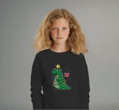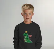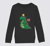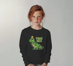 Un allegro dinosauro verde è decorato in modo spiritoso per assomigliare a un albero di Natale, con tanto di luci colorate e stella sulla testa. Le parole "Tree Rex" sono scritte in modo scherzoso accanto ad esso, per rendere ancora più festoso il tema.