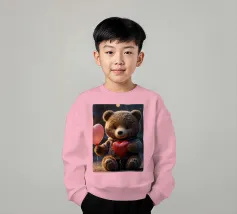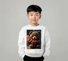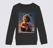 Un simpatico orsacchiotto vestito con un'accogliente felpa con cappuccio siede nella neve, tenendo gioiosamente un cuore rosso mentre un palloncino si muove nell'aria fresca della sera sotto un tramonto colorato.
