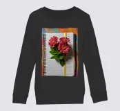 Un taccuino rilegato a spirale presenta tre fiori rosa e foglie verdi, disposti su una superficie di legno colorato, che invitano alla creatività e all'ispirazione.