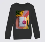 Un vivace spazio di lavoro mostra un quaderno a righe ornato da un fiore rosa, circondato da carte colorate e materiale artistico, che invita alla creatività e all'ispirazione.