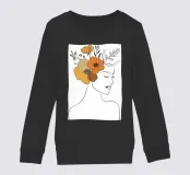 Un disegno al tratto minimalista raffigura il profilo di una donna dall'espressione serena. I suoi capelli sono ornati da grandi fiori stilizzati di colore arancione e giallo e da foglie delicate.
