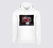 Una brocca bianca contiene un abbondante e traboccante bouquet di fiori in un tripudio di colori rosa, viola, rossi e gialli, dipinti in uno stile ricco, scuro e lunatico che sembra al tempo stesso classico ed espressivo.