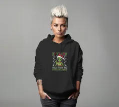 Un alieno verde che indossa un Babbo Natale e un maglione festivo si trova in un paesaggio innevato e mostra un segno di pace. Intorno all'alieno cadono fiocchi di neve e il testo sottostante recita: "Ho messo in pausa il mio gioco per essere qui".