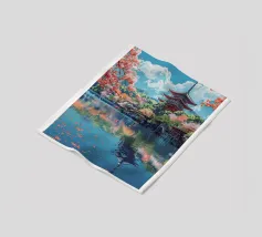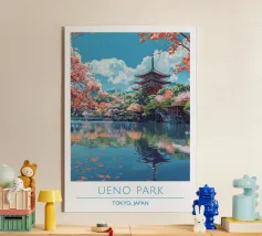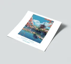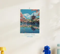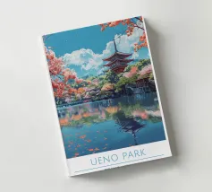 Scoprite la tranquilla bellezza del Parco di Ueno a Tokyo, in Giappone, con questa splendida stampa d'arte digitale. L'immagine cattura l'iconica pagoda a cinque piani e i templi circostanti che si riflettono nel lago calmo, incorniciati da alberi lussureggianti e da vivaci fiori di ciliegio (Sakura) in piena fioritura. Realizzata in un luminoso stile da poster di viaggio vintage, l'opera d'arte mette in risalto il connubio tra l'architettura tradizionale giapponese e la bellezza naturale della primavera. Questo download digitale di alta qualità viene fornito con un'eccezionale risoluzione di 7000x5000 pixel a 300 dpi, che garantisce una nitidezza superba e colori ricchi per una stampa di alta qualità.