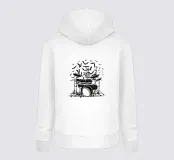 Illustrazione di uno scheletro percussionista che suona una batteria, in una tavolozza nera e grigia con accenti bianchi. Uno stile scuro e diretto, ideale per magliette rock e goth e abbigliamento dark.