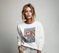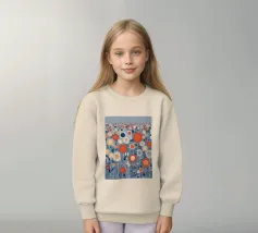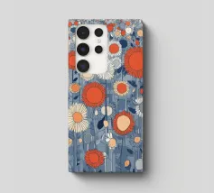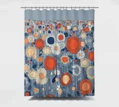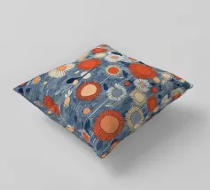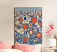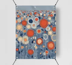 Un campo infinito di fiori grafici nei colori vivaci dell'arancio, del blu e del crema: moderno, giocoso e pieno di energia. La ripetizione ritmica crea una sensazione di infinito e leggerezza. Questo motivo porta il calore dell'estate e una moderna dichiarazione di design in ogni stanza.