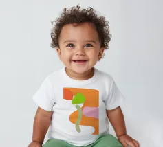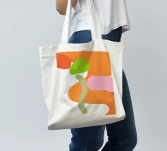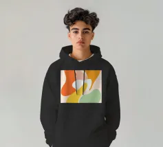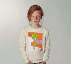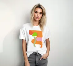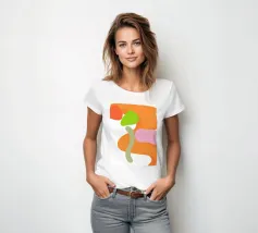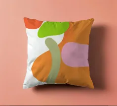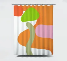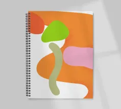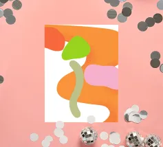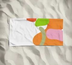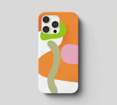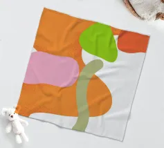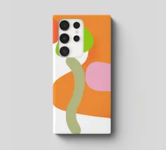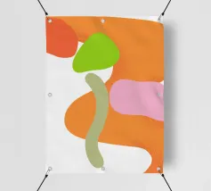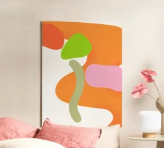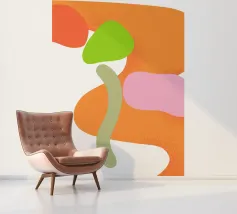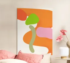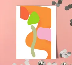 Forme audaci e astratte in arancione, rosa, verde e beige scorrono su uno sfondo bianco, creando una composizione dinamica e moderna. Il gioco di colori e forme suggerisce movimento ed equilibrio all'interno di un design minimalista.