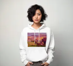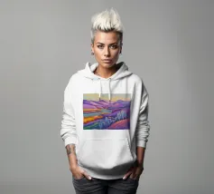 Morbide colline ondulate mostrano ricche sfumature di rosa, arancione e blu, mentre un cielo vibrante pieno di soffici nuvole esalta l'atmosfera tranquilla. Piccoli alberi punteggiano il paesaggio.